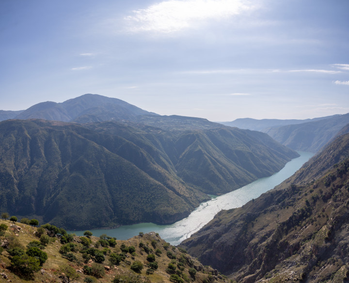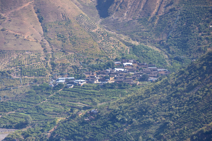 这些山顶比较平缓、植被不多,峡谷中还有村寨。
