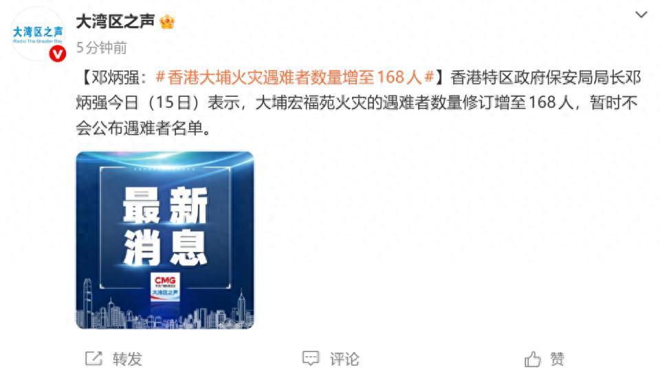 香港特区政府保安局局长邓炳强今日(15日)表示,大埔宏福苑火灾的遇难者数量修订增至168人,暂时不会公布遇难者名单。